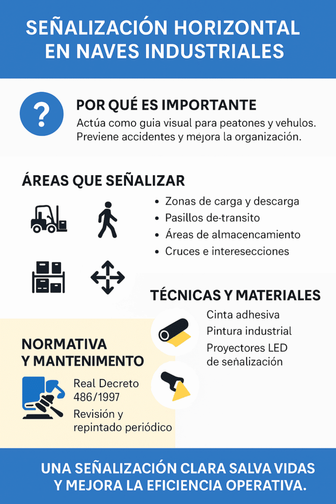 En conclusión, la señalización horizontal en naves industriales y centros logísticos no solo es una medida de seguridad fundamental, sino también una herramienta esencial para la optimización de operaciones y la mejora de la eficiencia.