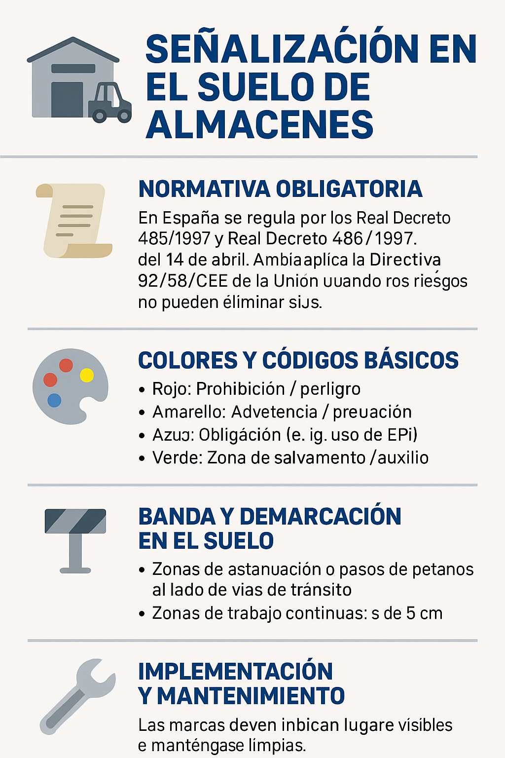 La normativa de señalización en el suelo de almacenes en España está regulada por el Real Decreto 485/1997 y Real Decreto 486/1997 ambas del 14 de abril, sobre señalización de seguridad y salud en el trabajo ( BOE 23 abril 1997).